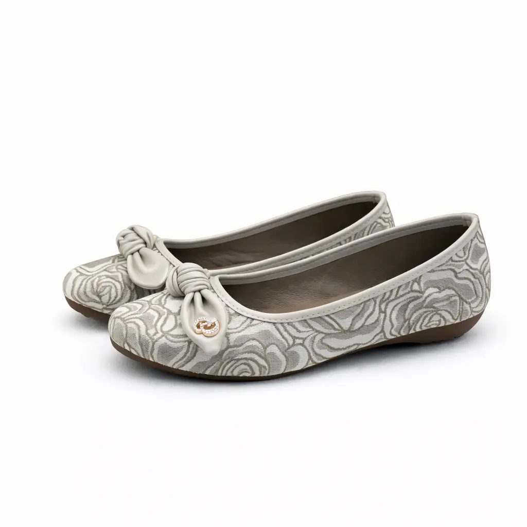 Comfortable cream ballerina flats with printed design and front knot, suitable for daily wear, office, and light party wear.