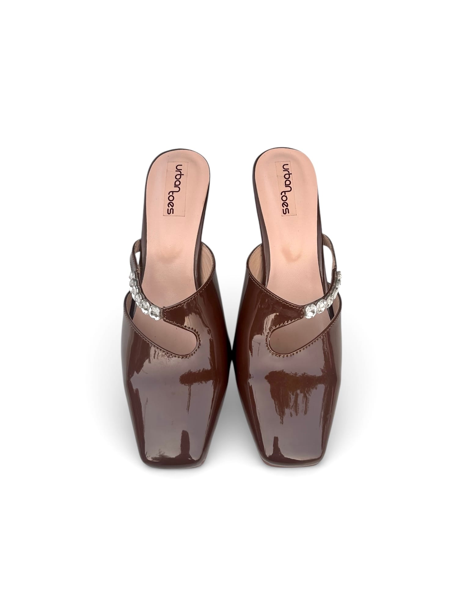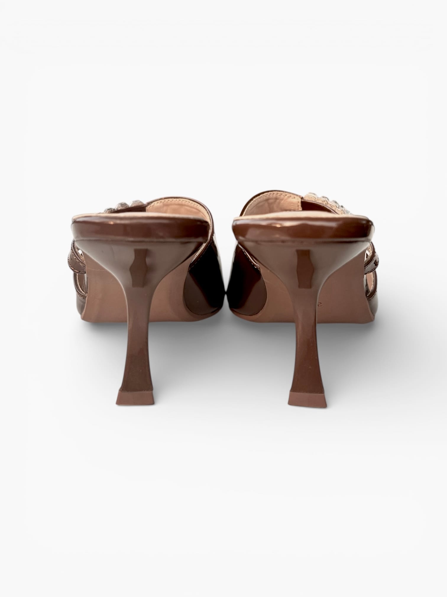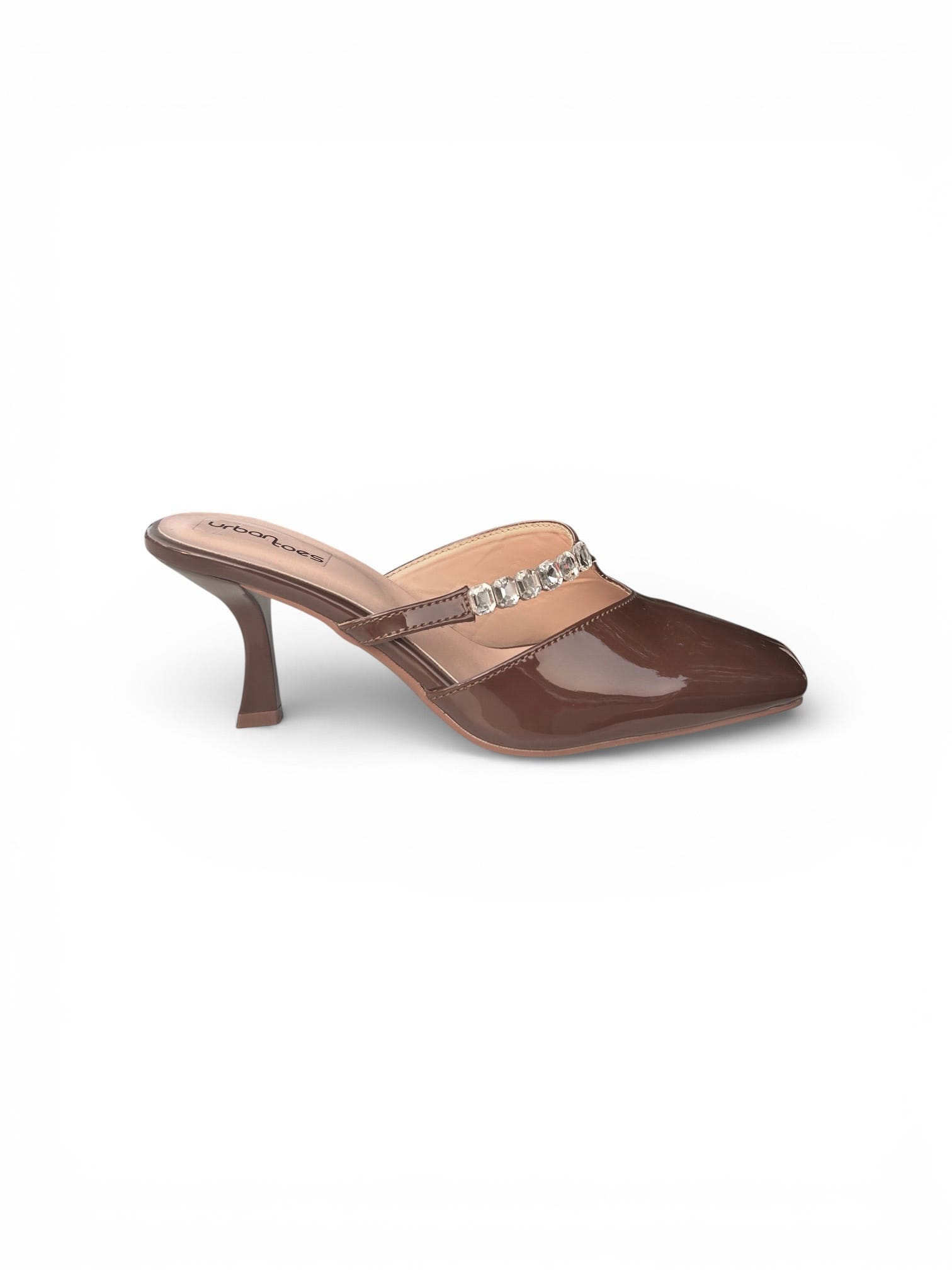 Shop elegant pencil heel mules brown for women. Stylish slip-on design with sleek heels—perfect for parties, evening wear & special occasions.