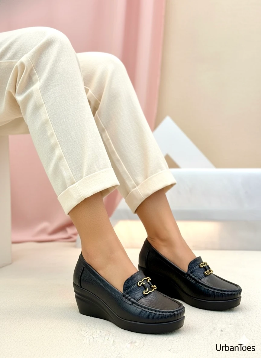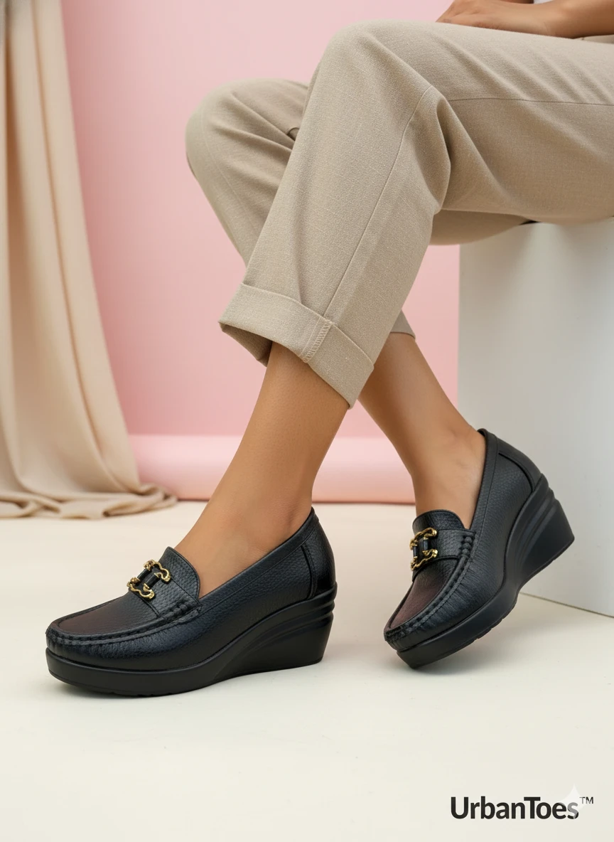 Classic black wedge loafers with gold buckle detail, designed for all‑day comfort and everyday elegance. Perfect for work, casual outings and travel, they pair effortlessly with ethnic and western outfits.