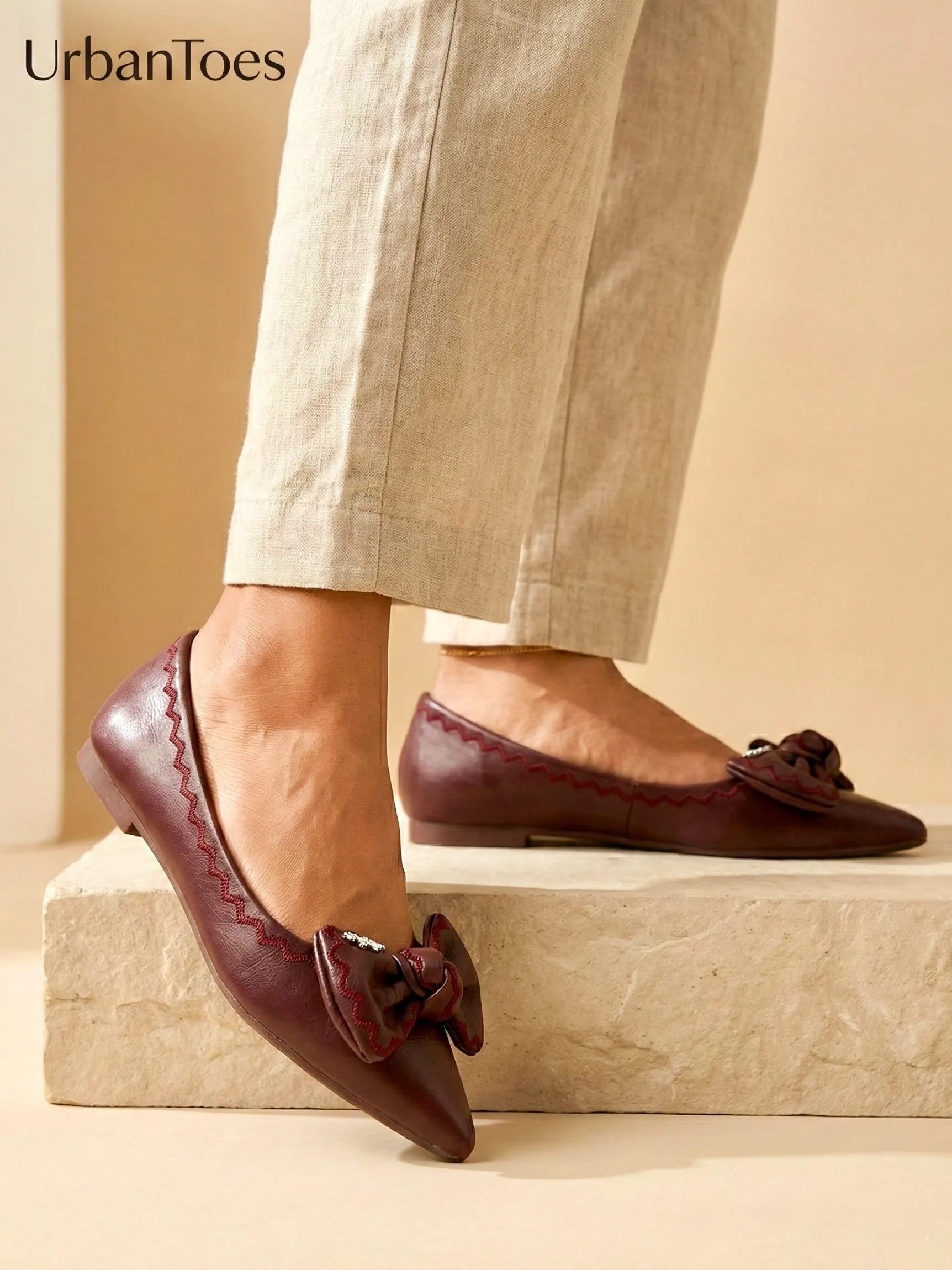 Refined, feminine, and effortlessly versatile, the UrbanToes Élise Bow Leather Flats are crafted for women who appreciate understated elegance. Made from smooth, premium leather, these flats feature a sleek pointed toe that elongates the silhouette, paired with a softly structured bow adorned with subtle crystal detailing for a touch of sophistication.