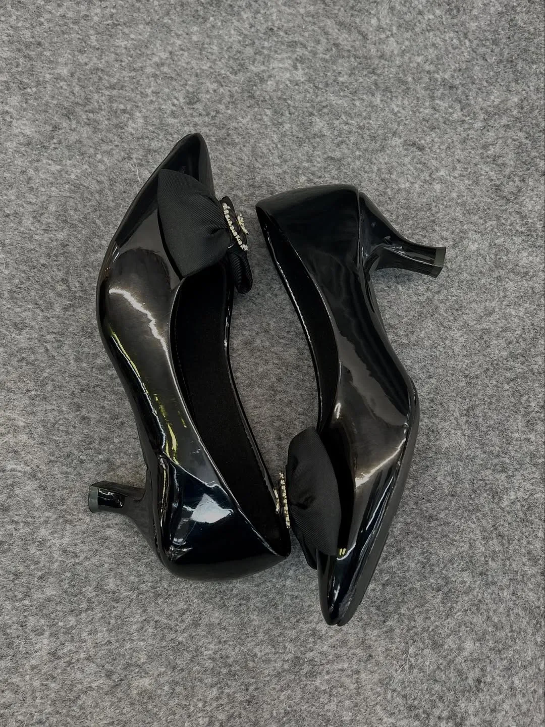 Chic Aesthetic: Sleek pointed-toe silhouette that elongates the frame, topped with a delicate fabric bow and a sparkling rhinestone center.
