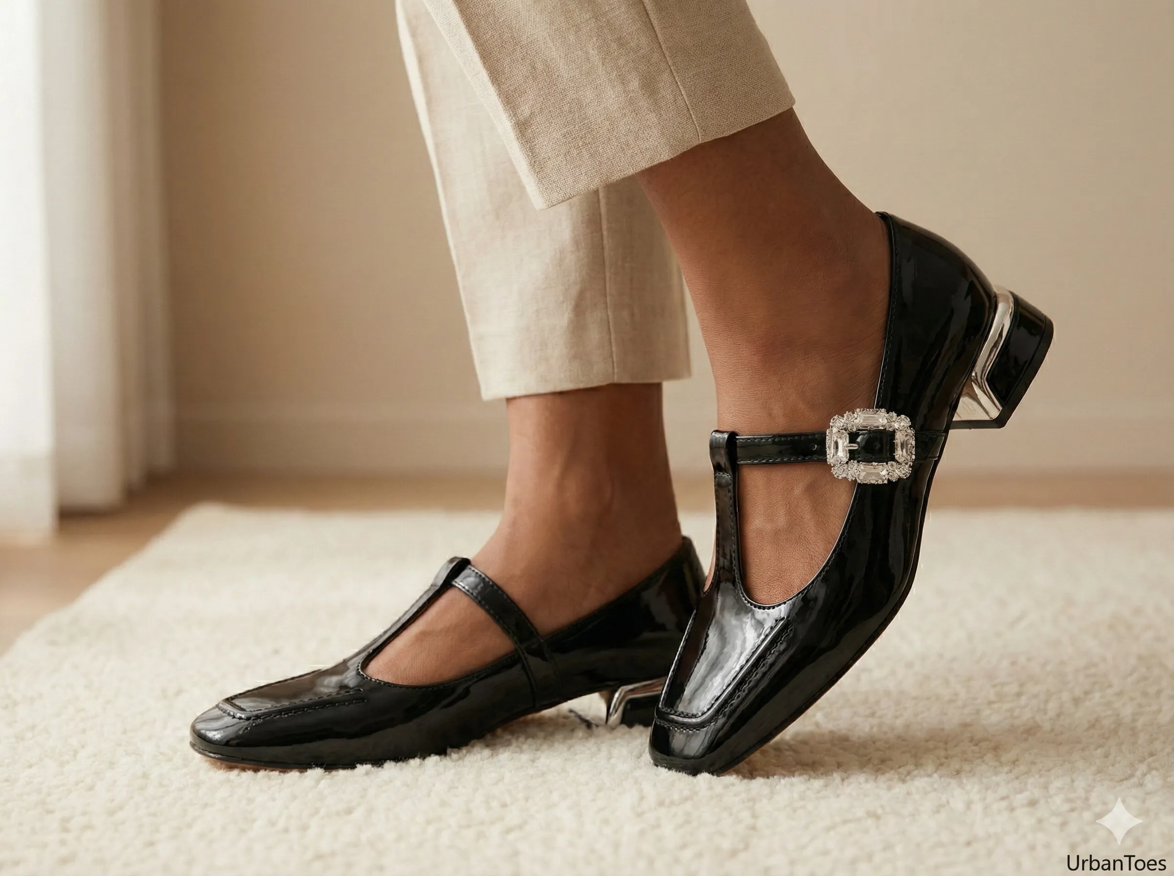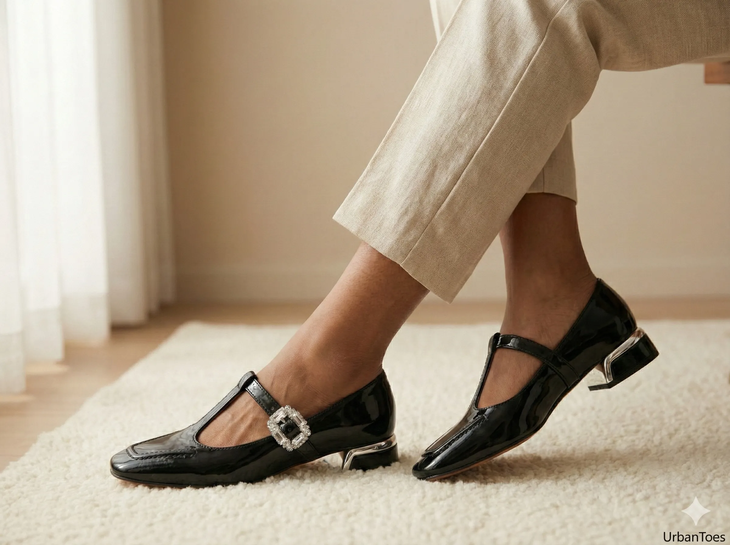 Elegant patent Mary Jane heels with crystal buckle and comfortable low heel—perfect for office wear, festive occasions, and long Indian days.