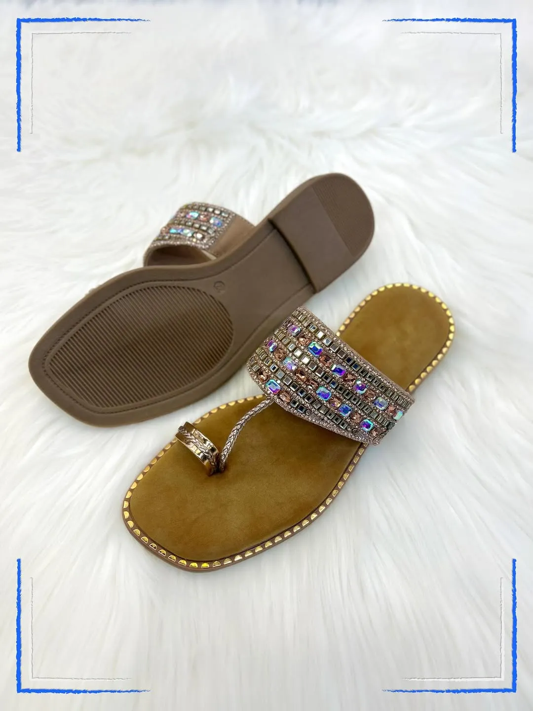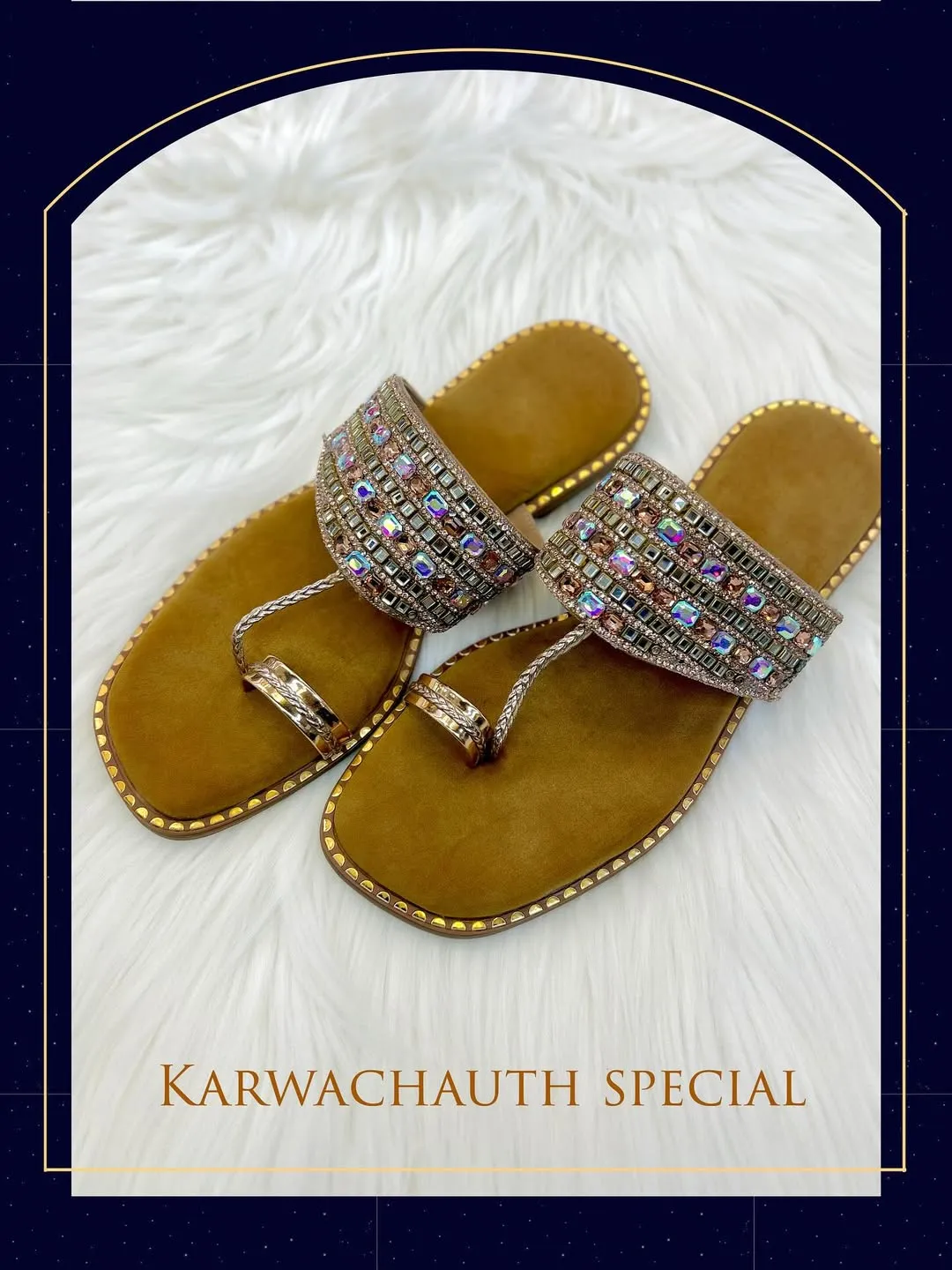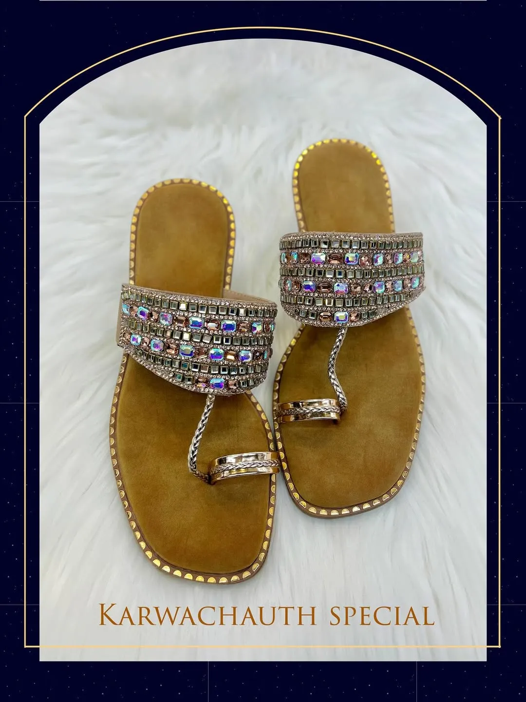 Artisanal Luxury for Your Feet Celebrate heritage with a touch of modern sparkle. These Kolhapuri flats feature a unique multi-row strap encrusted with faceted crystals that shift color as you move.