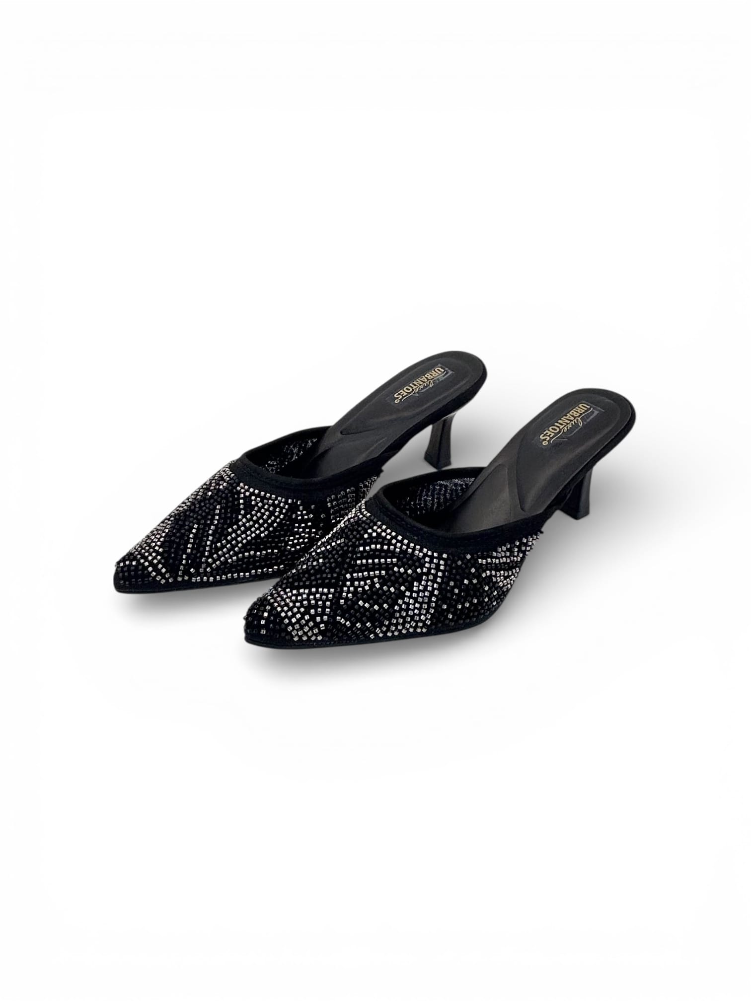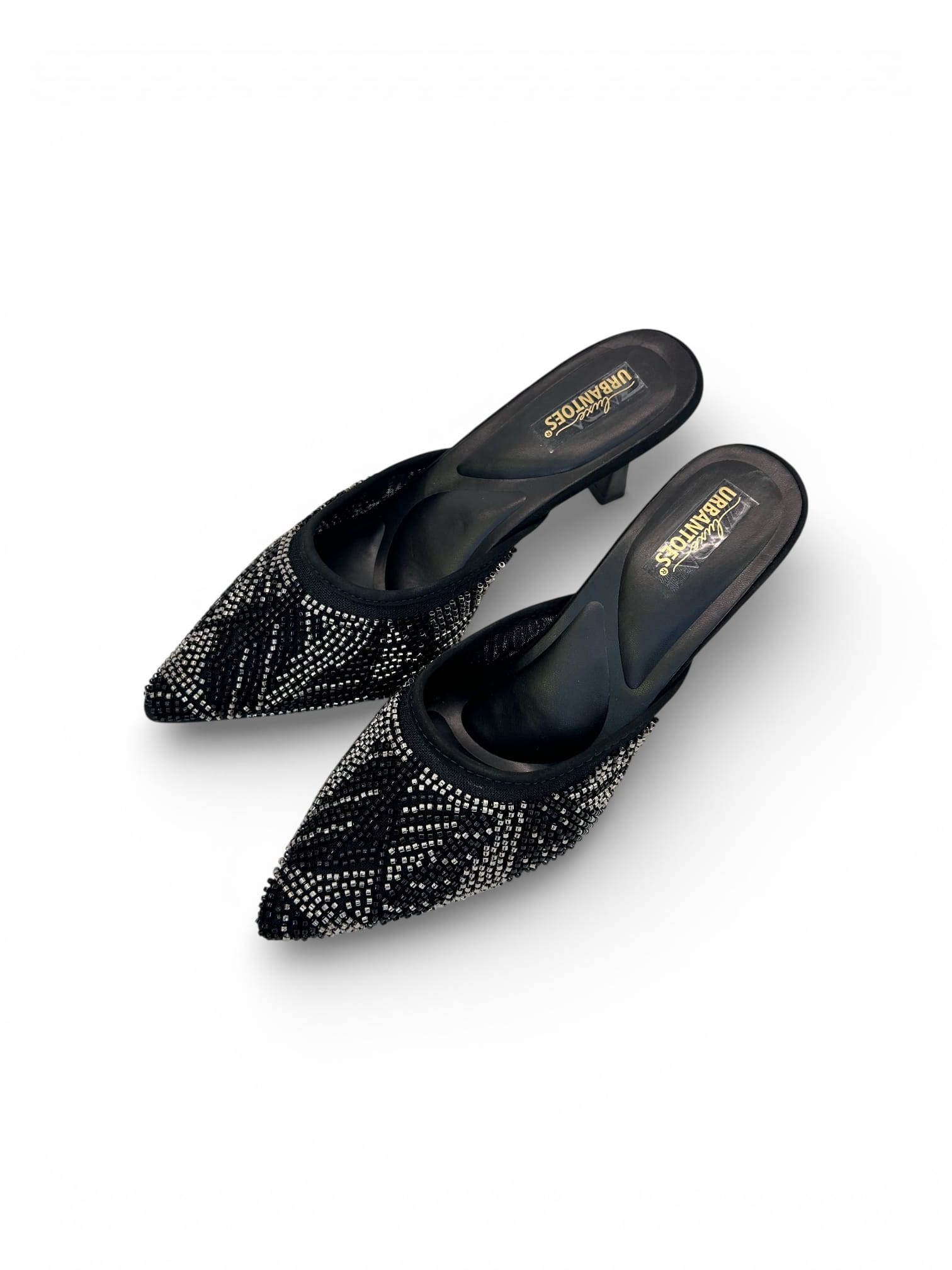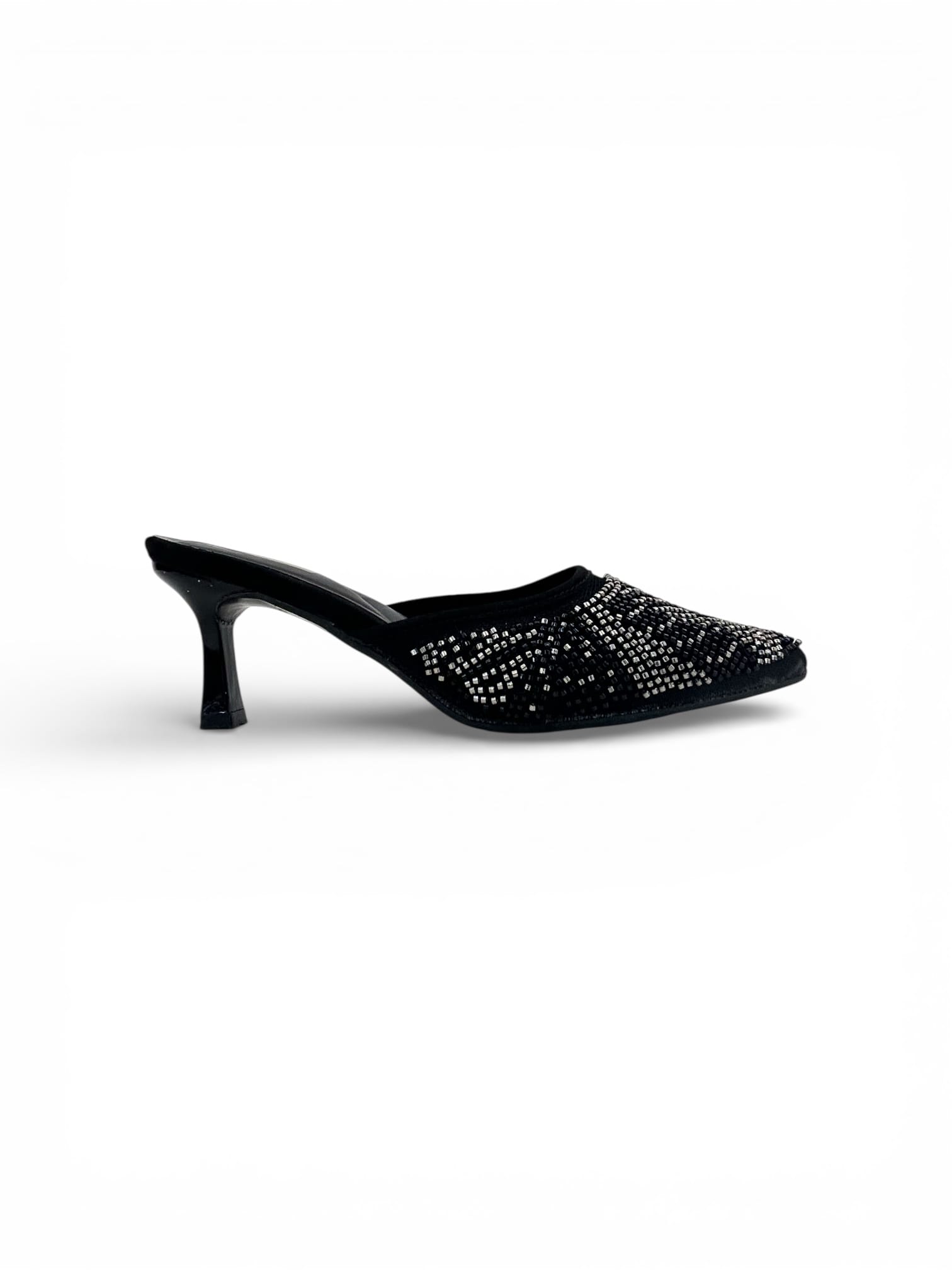 The slip-on black embellished mule heels design makes them easy to wear, while the comfortable mid-height heel offers balance and support, allowing you to stay stylish without compromising on comfort. The softly cushioned footbed ensures ease even during long hours at weddings, parties, or celebrations.