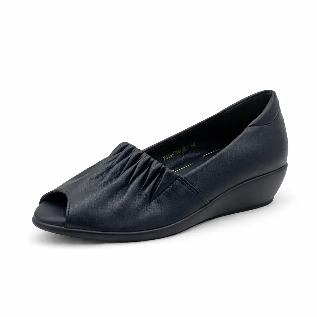 Stylish black peep-toe wedge shoes with a soft cushioned insole and wrinkle-detail upper. Ideal for office, daily wear and long hours of comfort.